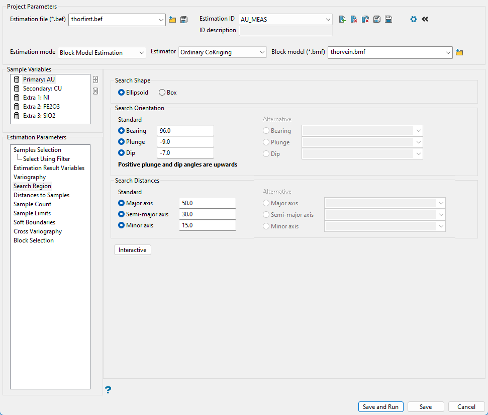 If you want block model variables to be used as radii for restricted search ellipsoid or the bearing, plunge, and dip values of the restricted search region, click the option labelled Use block model variables. All the block model variables will populate the drop-down list of the respective fields.