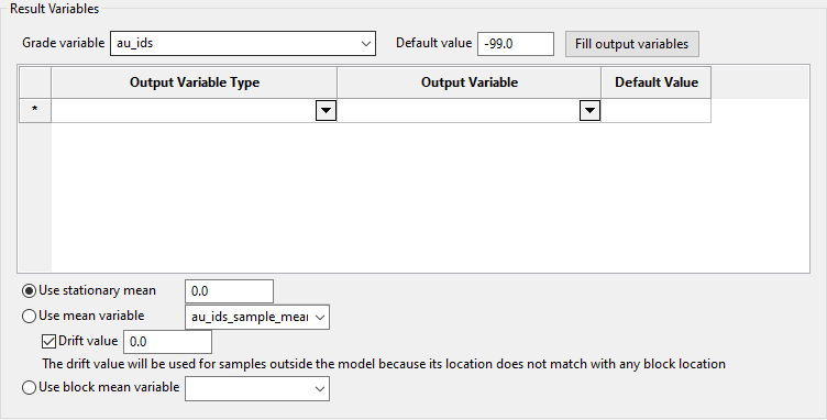 Note: During the grade estimation process, any blocks that have been selected but do not get an estimation value will receive the grade estimation default value. All blocks that have not been selected will retain their block creation default value. As a result, you could end up with two default values within the block model. If block selection criteria has not been specified, i.e. all blocks are selected, then the blocks not receiving an estimated value will have their block creation default value overwritten with the grade estimation default value, that is, one default value exists.