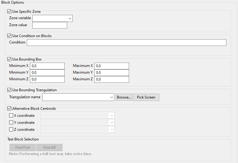 Select this checkbox to restrict the estimation to those blocks whose centroids lie within a specified range of coordinates. Enter the minimum and maximum coordinates (in the X,Y and Z directions). These coordinates are offsets from the origin of the block model (that is, block model coordinates).