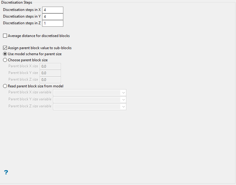 For uniform conditioning, we require the variance within both the SMU sized blocks and the panels. Therefore, you must specify the discretisation for both. In general the 10 x 10 x 10 does not need to be changed. One time you might change them is when doing 2D uniform conditioning (such as a single bench).