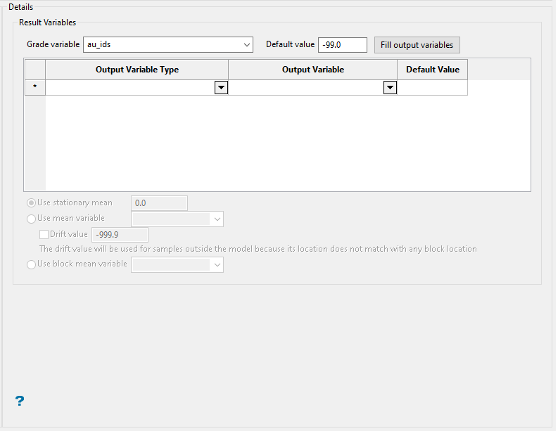 Specify the variable in the block model to receive the weighted estimate. You must select one block model variable for every input variable you select.
