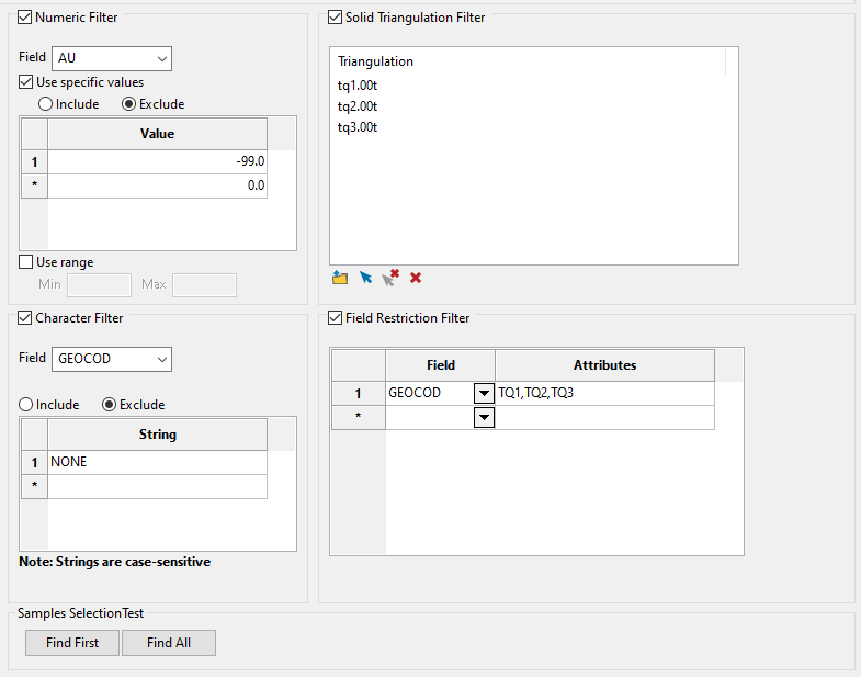 Use this panel to filter your sample data by setting restrictions on samples values, triangulations used, character values within database fields, or field attributes. You can use any combination of the four filters, or not use any at all. This panel is optional.