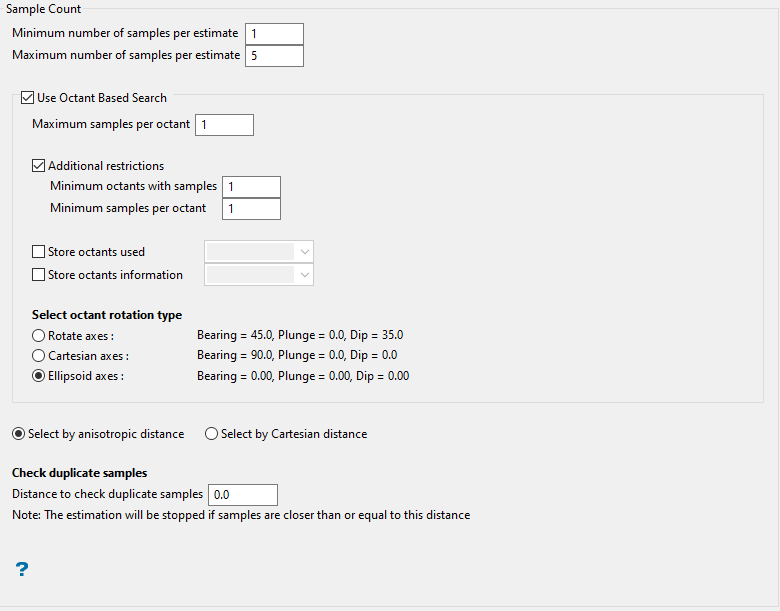 When you select Limit number of drillholes per estimate, both the minimum and maximum number of drillholes per estimate must be specified. If you would like to apply only one of these parameters simply set the other parameter to an appropriate value.