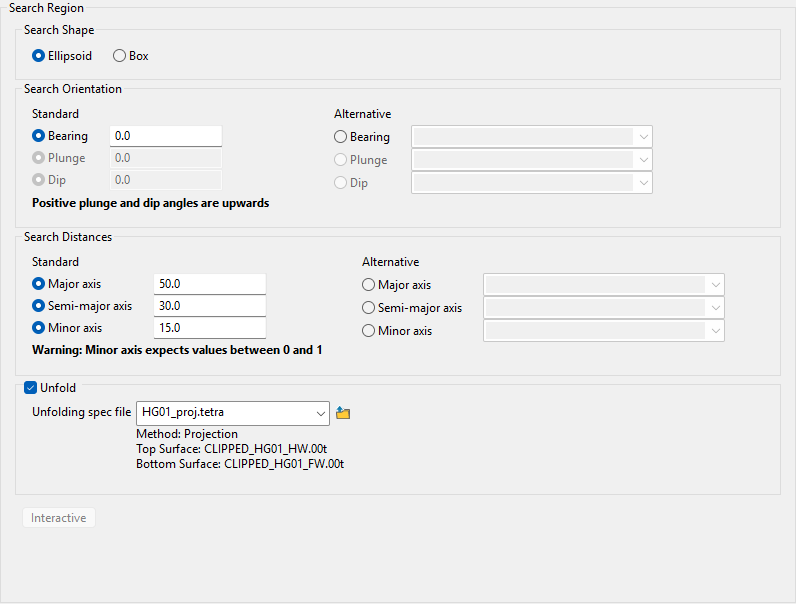 Enter the bearing, plunge, and dip of the restricted search region or select a block model variable from the drop-down list.