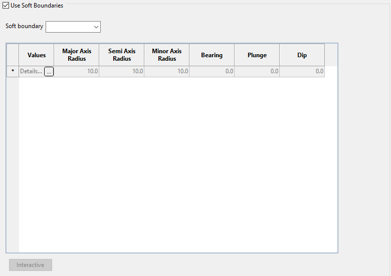 Use this panel to setup soft boundaries. Sometimes samples that are at a different estimation domain share similar grade properties when they are located close to the limit between the domains. This is often known as a soft boundary between the domains. In this case, it could be useful to include samples from a different domain but only at short distances from the blocks in the current domain.