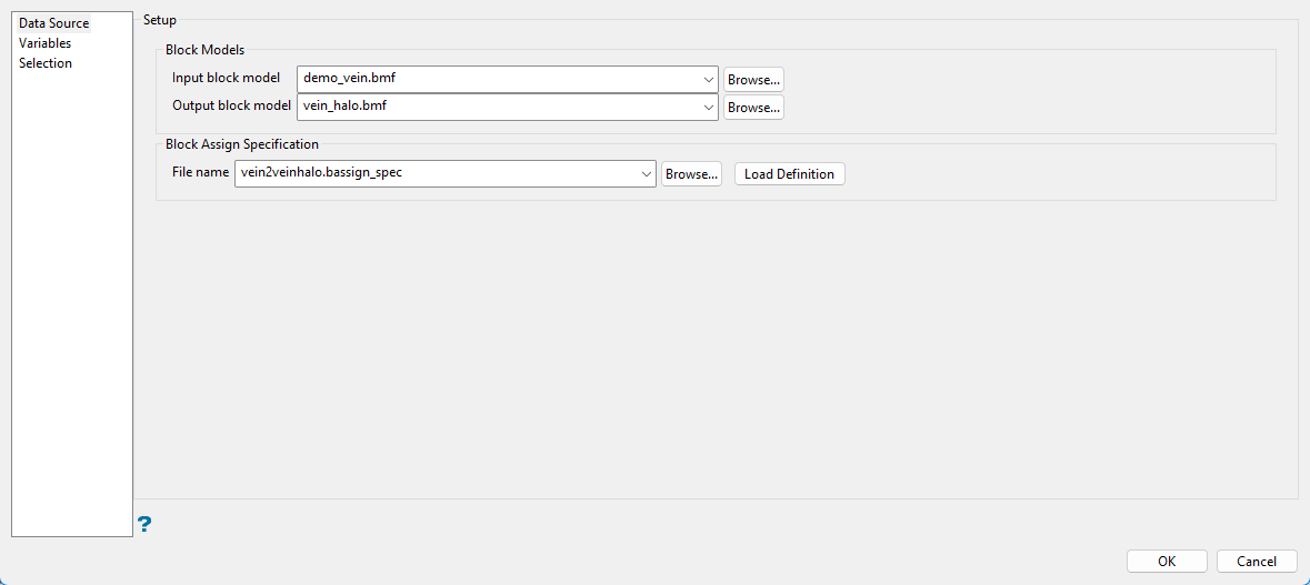 Select a specification file from the File name drop-down list, or enter a name for a new one. When entering a new name, the file extension (*.bassign_spec) will automatically be added. As the variable details must match, an existing file should only be selected if it was created with the same input and output block model.