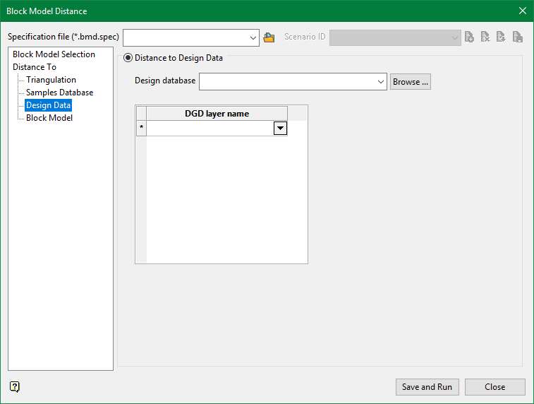 Use this option to calculate the distance from each block in a block model to the nearest boundary of a triangulation, block with a particular value assigned to a variable, nearest intercept of a drillhole, the nearest point of a polyline, or nearest section of a polyline.