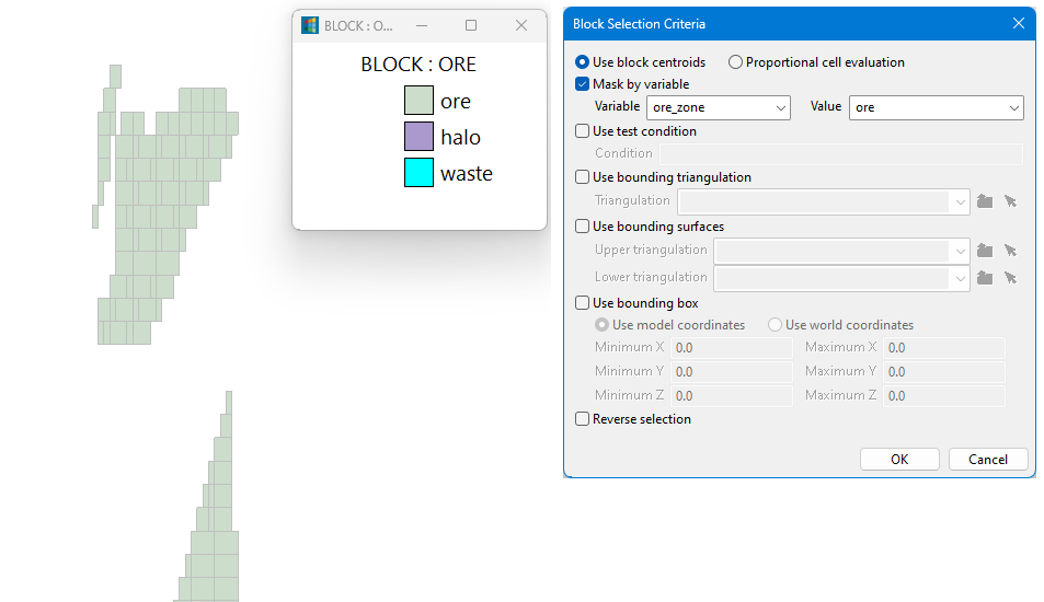 Materialin your block model and want to restrict blocks to those where the material equals ore, selectMaterialas the variable and enteroreas the value. However, if you require all blocks that do not have this specified value, then enable the Reverse matching check box towards the bottom of the panel.You can also limit the blocks by adding a condition on a numeric block model variable.