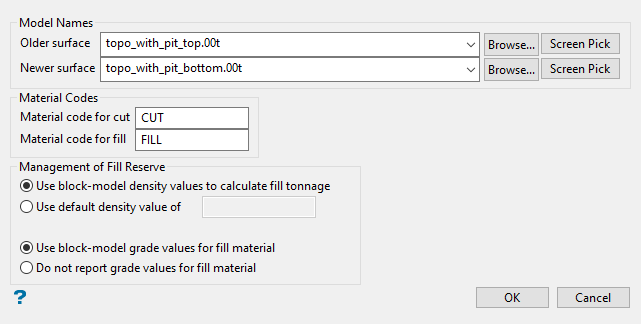 Use block-model grade values for fill material - Select this option to use the grades values from the chosen block model when calculating the grade values for the fill material.