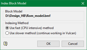 Use the Index option to create a spatial index to reference a block model. The spatial index decreases the access time to the blocks and therefore is particularly useful as models increase in size.