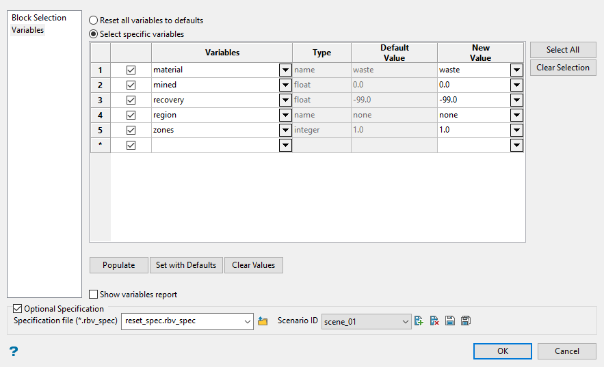 Action Select All Enables all check boxes in the first column of the table. Only variables selected in this way will be reset. Clear Selection Clears all check boxes in the first column of the table. Populate Populates the table will all user-defined variables found in the chosen block model.