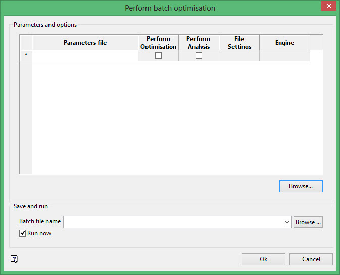 Use the Batch option to select a series of parameter files (.opf) to automatically run multiple optimisation jobs. This option is very useful when you need to evaluate different optimisations or analysis in one step. Parameters files can contain information to be used with optimisation and analysis at the same time.