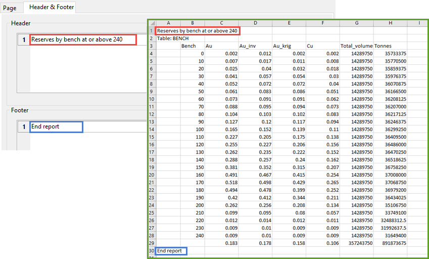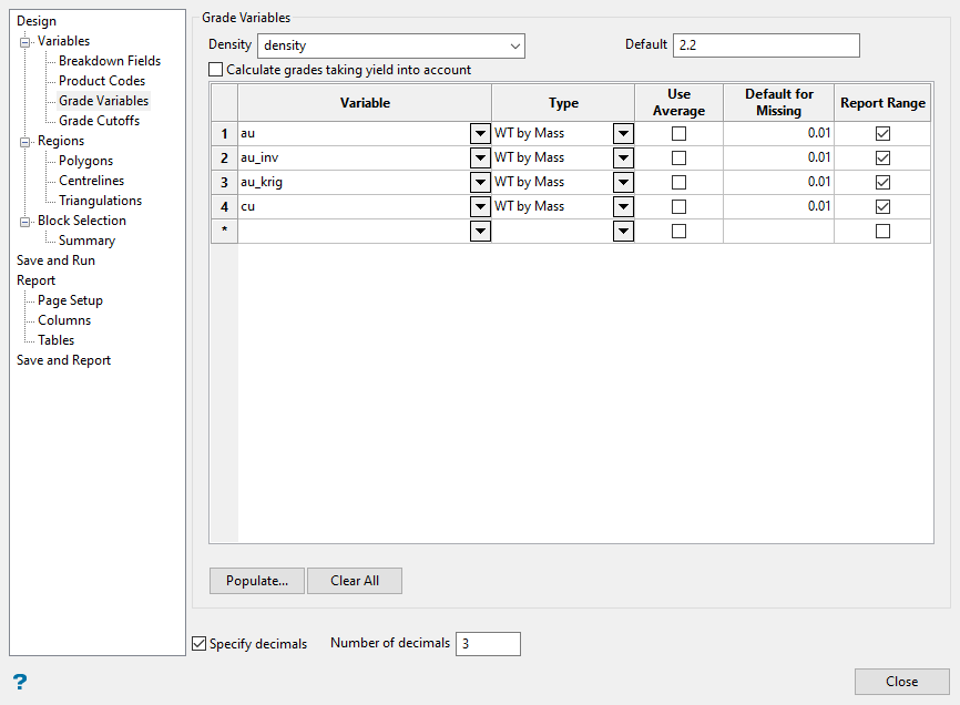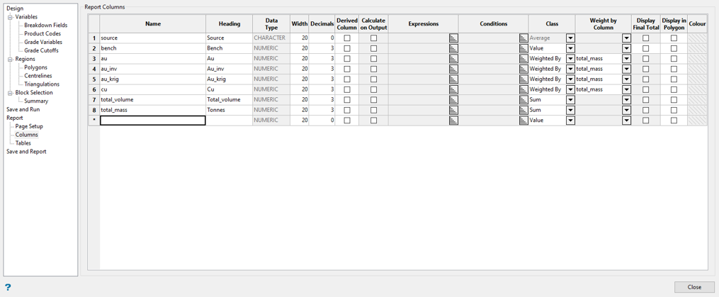 Note:  If Use Average or Default for Missing is not used, Advanced Reserves reports an extra Volume and Mass column for each variable. The columns will report the grade and tonnage values for all blocks that do not contain the construction default values.