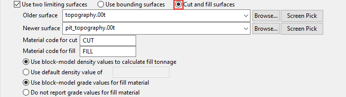 The Mined out (or fillpc) field lets you select a variable in the block model that stores information regarding whether a block has been mined or not. This is used in conjunction with the option Block > Manipulation > Mine.