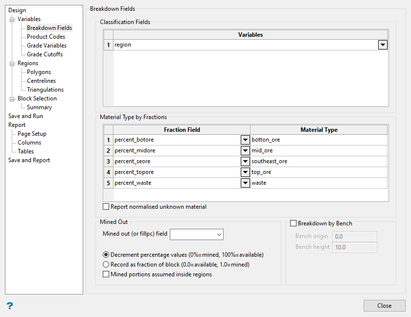 In the Breakdown Fields panel, you can report reserves in more detail. Classification Fields are the variables in the block model where the reserves are broken down. Common variables used are geology, rock types, or ore zones. Furthermore, Material Type by Fractions reports the total ore or waste contained in each block if variables exist in the block model that contain this information. This section is usually used when reserving a partial model imported into Vulcan from other software.