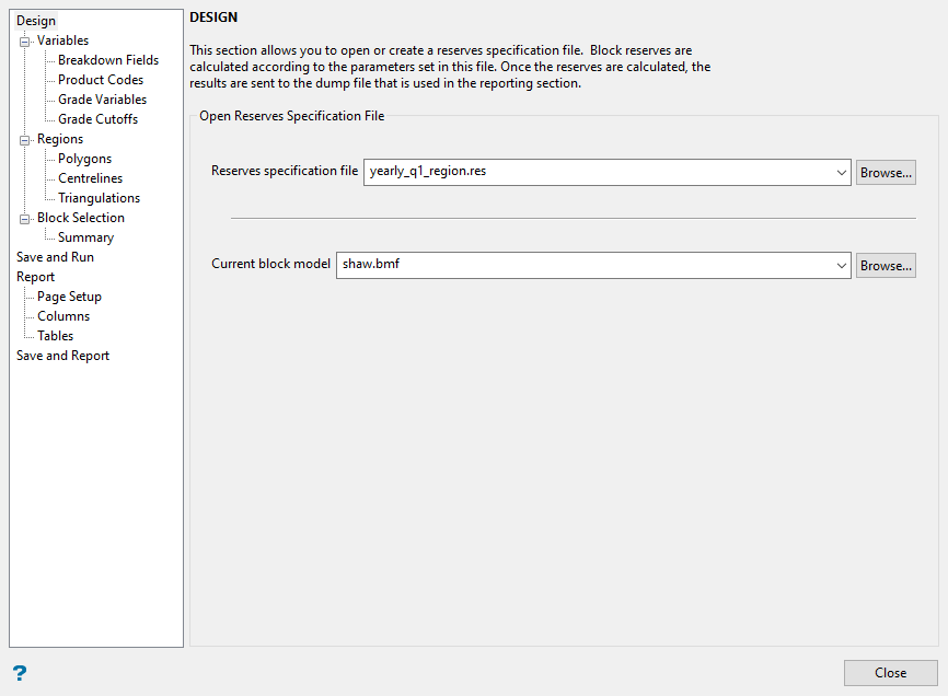 You can reuse a specification file on any block model as long as the variables and parameters settings are appropriate for that model. This makes it easier to run reserves on multiple block models without having to set up a new specification file for each run. Just save the edited specification file under a new name to avoid overwriting an existing file.