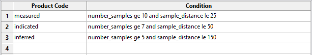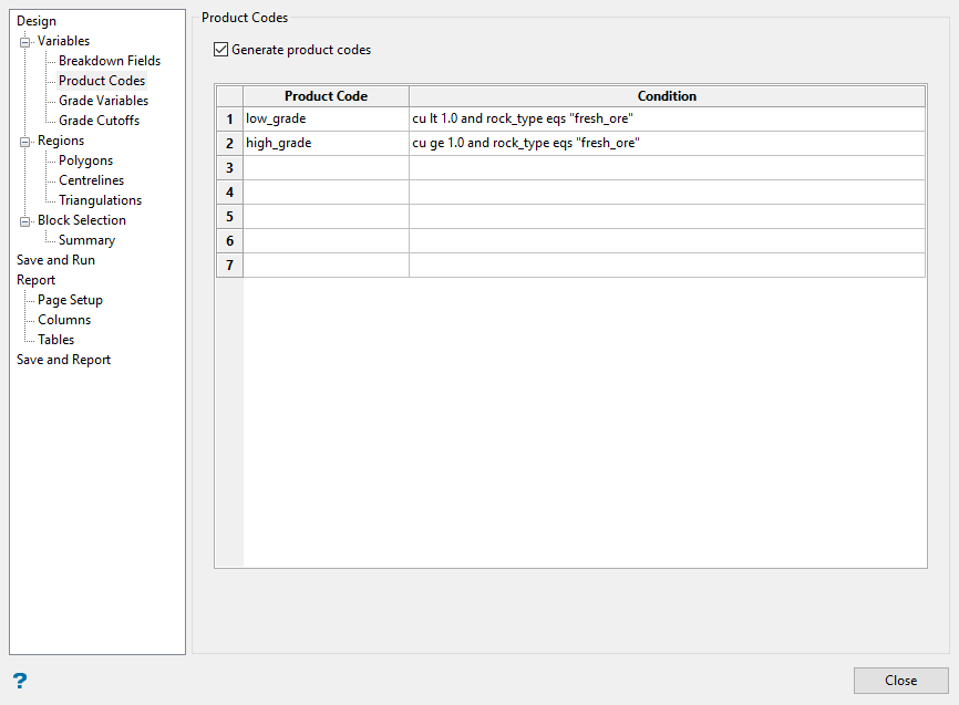 Use the Product Codes panel to create temporary variables based on conditions created for reporting purposes. These temporary variables are not added to the block model but only exist in the Advanced Reserves report.