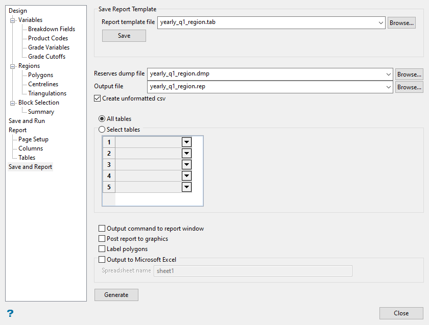 Note: The report (.tab) file does not store a link to the dump file. Therefore, if the editor was opened without selecting a dump file, the Reserves dump file will need to be selected on the Save and Run panel before generating a new report.