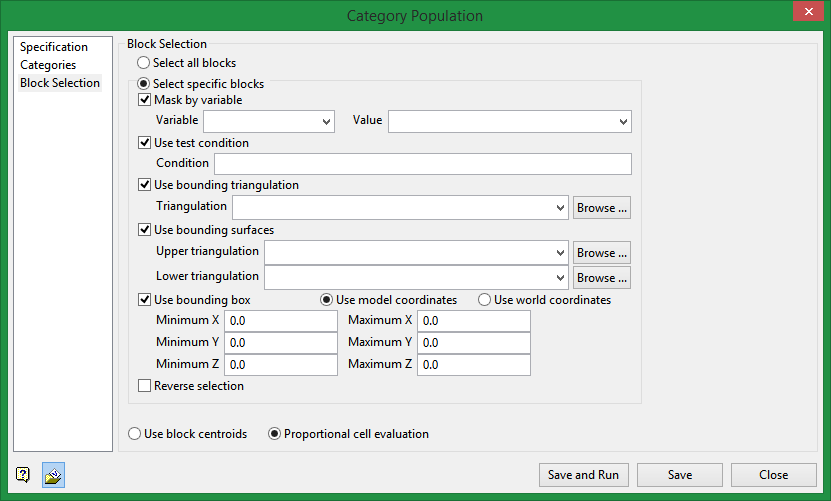 This section allows you to define the selection criteria for selecting blocks from the block model for the category population action.