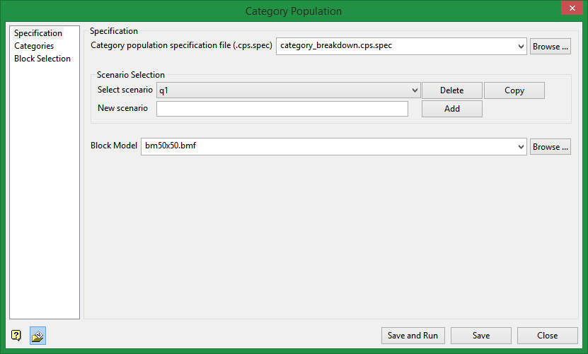 Note: The fields in this panel must be filled in sequentially. You must enter/select a specification name before the Scenario Selection functionality will become accessible. In turn, you must then select an existing Scenario name, or Add a New scenario before the Block Model field becomes active.