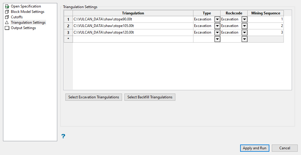 Note: Triangulations should be chosen by the sequence in which they are to be mined. If necessary, the Mining Sequence column can be used to manually change the mining order.