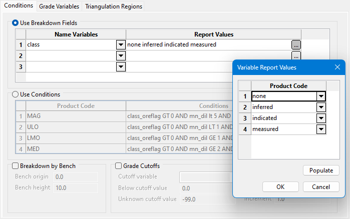 You also have the option to use a grade cut-off variable to breakdown the reserves. You will need to specify the cut-off variable. Grade cut-off values are specified as a range (first and last values), increment or explicitly by value.