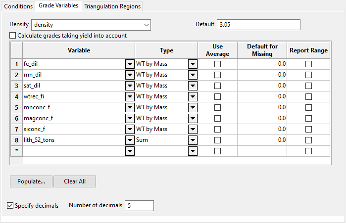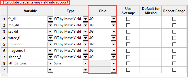 mass,wt by vol,sum, orwt by mass*yield.Type Definition Sum Used for variables containing units (for example, grams of gold) that should be cumulated rather than averaged. Wt by Vol Used for grade variables containing values based on volume weighted average (for example, grams of gold per cubic metre). Wt by Mass Used for grade variables that should be treated as a weighted average based on mass (for example, grams per tonne of gold). Wt by Mass*Yield Used to calculate the percentage of mass.