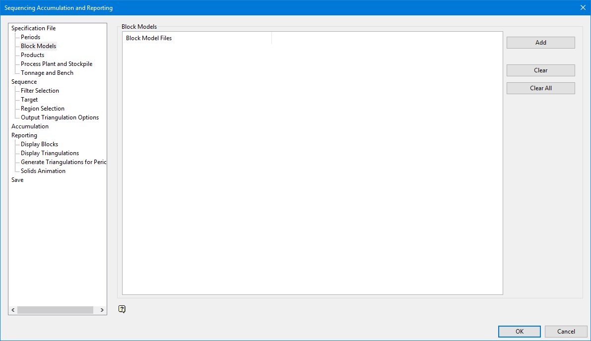 On the Block menu, click Sequencing Accumulation and Reporting, and then click Block Models to display the following panel.