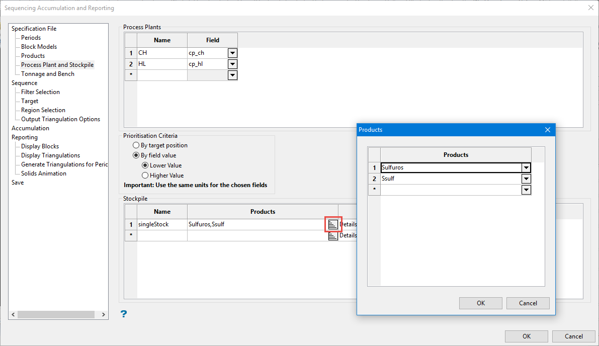 Click the icon to display the Products panel. Use the drop-down list to select each products that will be used in the stockpile calculation. The list is populated from the table at the top of the Products pane.