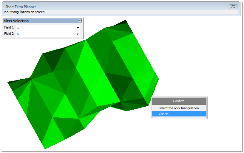 Select this option to add two triangulations to the sequence, select the filter to use, and pick the triangulations to add to the sequence. The mined direction is defined by the vector between the centroids of the solids selected.