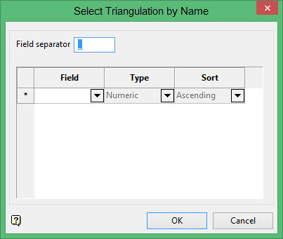 This panel is used to sort the triangulations by name, based on fields separated by the Field separator value. It prompts you to select the desired fields and define its type, (Alphabetic or Numeric) and sort order (Ascending or Descending).