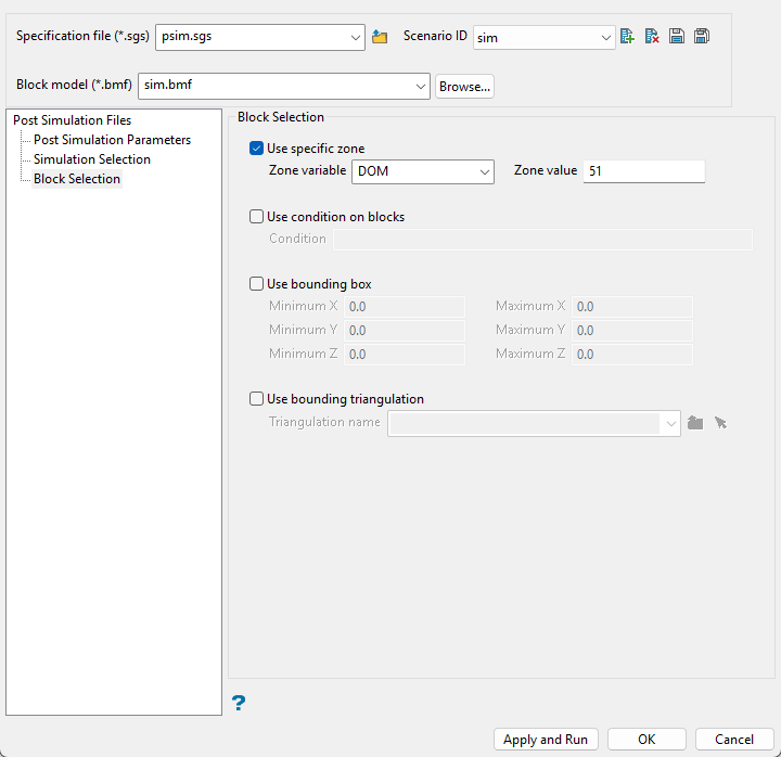 The Post Simulation option provides all the tools to process the results of a block model used in simulation. The distribution for each block is assembled from the value of each realization stored in the block model variables. With this block distribution several outputs can be obtained, such as the mean, variance, mean above and below a given cutoff, grade for a given probability, probability for a given grade and symmetric interval limits.