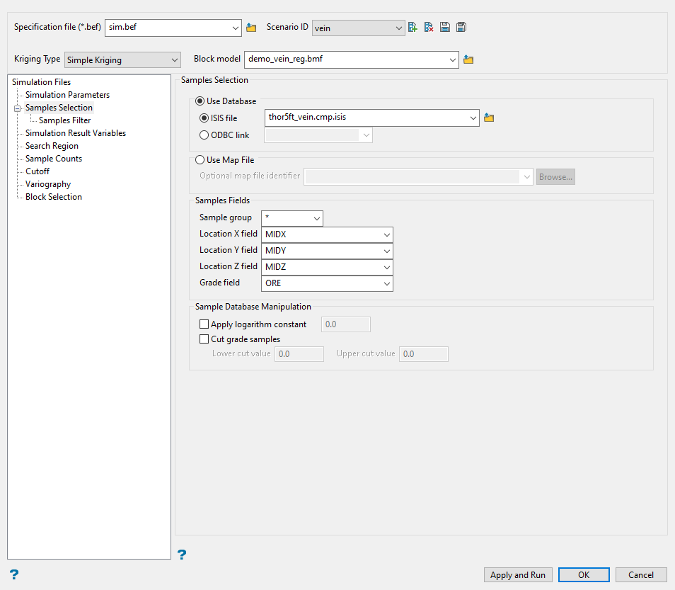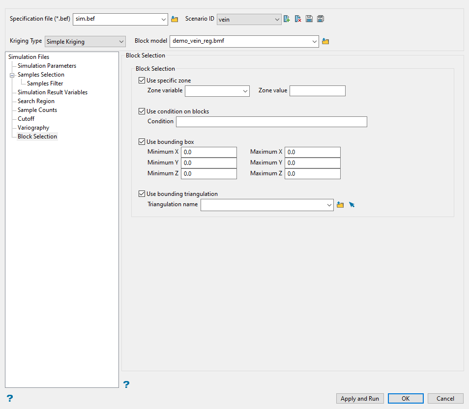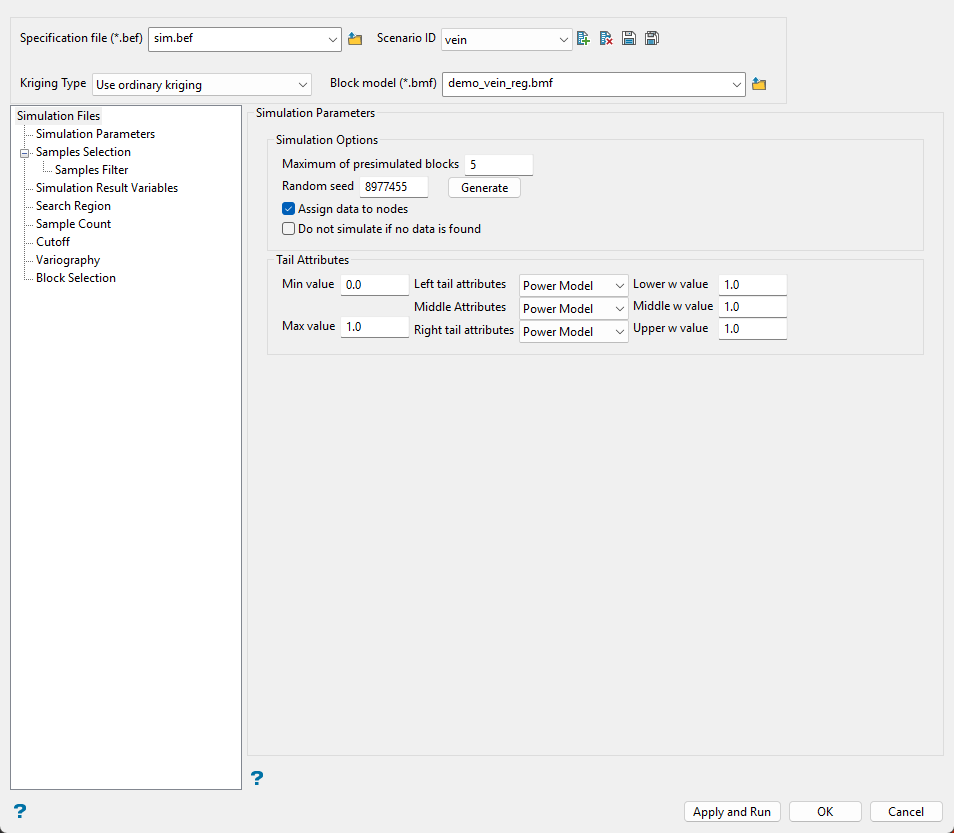 Use this pane to define the specification file, scenario ID, kriging method, and block model. You can also select which simulation options to use, and set the tail attributes.