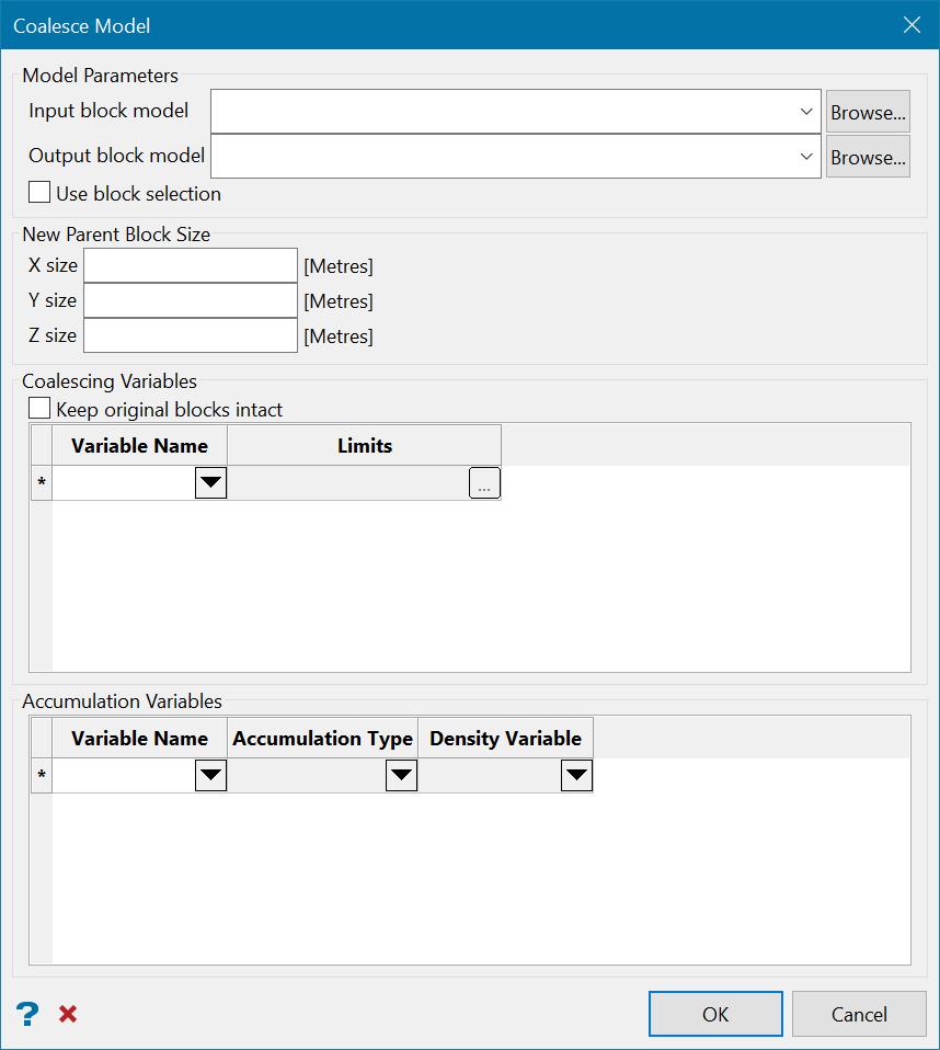 This section of the panel to define the accumulation variable(s). These are variables will be transferred to the nominated output model. You will need to define the method that will be used to transfer these values to the new block model. You have the choice of selecting 'Sum', 'Average' or 'Weighted_Average'. When using the 'Weighted_Average' method, you will need to nominate a density variable.