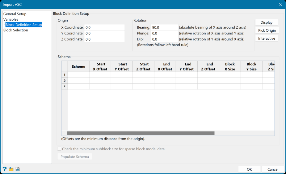 This option will read through the ACSII file to determine the block schema information. The Origin and Rotation information is taken into account when using world coordinates.