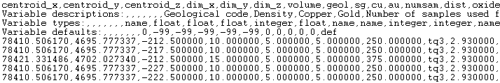 This line contains the field names of the data in the CSV file. These names consist of seven standard field names (X, Y and Z coordinates of the block centre, X, Y and Z lengths of the block and block volume), and the variable names (there is no limit to the number of variables). |