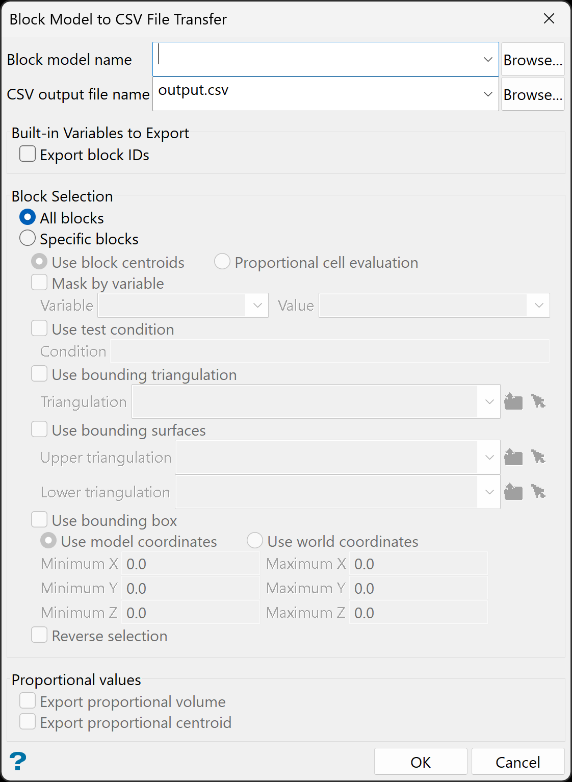 Note: If the block model origin is set at 0,0,0, then select Use world coordinates for the minimum and maximum X, Y, and Z coordinates. If the block model origin is set at real world coordinates, then enter coordinates for the bounding box that are offset a certain distance from the origin. The distance of offset will be determined by the dimensions of your bounding box. It will be the distance to the minimum and the distance to the maximum X, Y and Z from the origin of the block model.