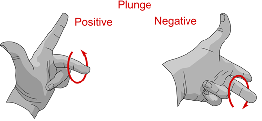 The degree of plunge is measured from the Minor axis, or thumb. Plunge changes with rotations around the Semi axis, or middle finger. Positive and negative rotations are illustrated below.