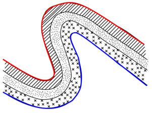 The following image illustrates how the top surface (red) and the bottom surface (blue) can have an arbitrary relationship. Neither surface is above the other, but these are valid surfaces for bend unfolding.