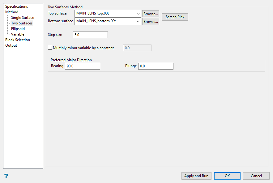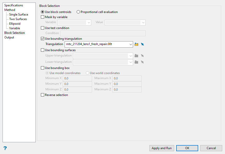 Select the Use bounding surfaces checkbox to restrict the blocks by bounding surfaces. Select triangulations from the Upper triangulation and Lower triangulation drop-down lists, or click Browse... to select triangulations from a location other than your working directory.