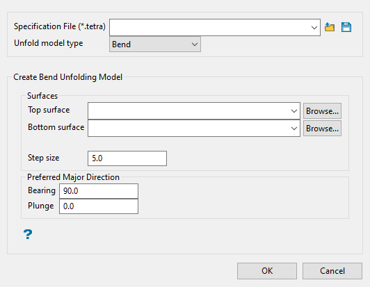 .tetra) file is chosen, the ratios calculated there are applied to the largest of the three search distances that have been defined in the grade estimation panel; this typically being in the major axis direction. It is from the application of these ratios to the largest distance in the panel that the other two shorter search distances (typically the semi-major and minor) are calculated. These search distances are used for the estimation. The two shorter distances defined in the estimation setup are effectively ignored in preference of those calculated using the ratios from the (.tetra) file applied to the largest distance.The parameter inputs will be different for each unfolding model type.