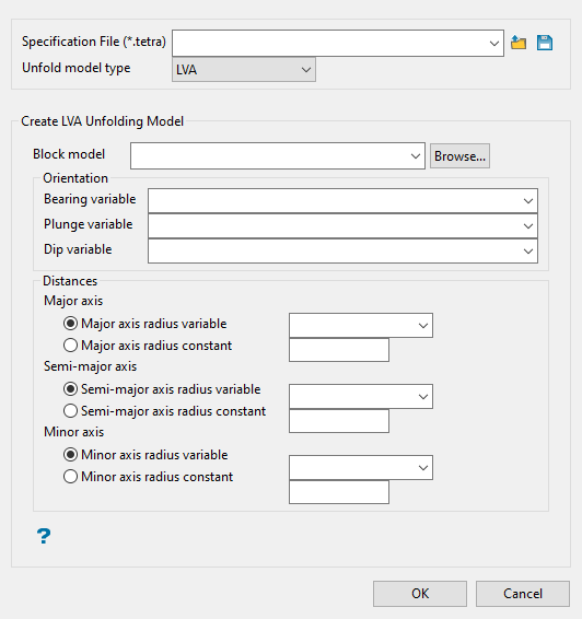 .tetra) file created by using the Block Unfolding options Bend Model, Projection Model, and Create LVA Model.As part of the unfold model definition for the LVA model type, you are required to define distances in the major, semi-major and minor axis. These are used to establish ratios between the distances in those directions, as opposed to the actual search distances to be used in grade estimation. For this reason, if the three axes were defined as 100 m x 50 m x 10 m, it would yield the same ratio as if they were defined as 50 m x 25 m x 5 m in this panel.