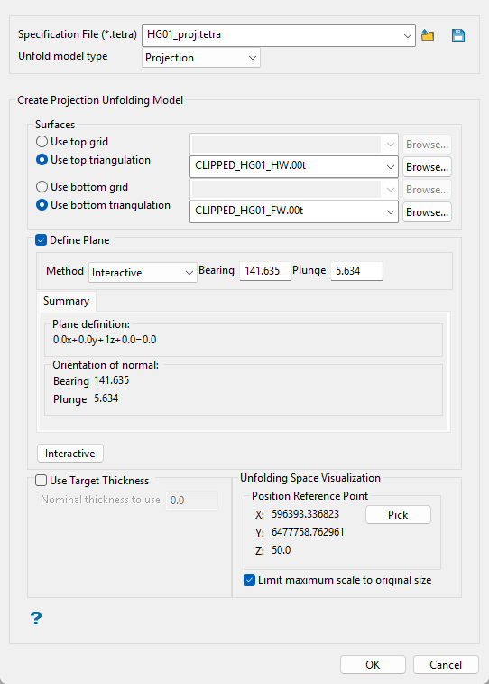 Typically, all your sample data and estimated blocks will be between the top and bottom surfaces. However, this is not a requirement. Points above the top surface will have Z coordinates greater than '1' and points below the bottom surface will have Z coordinates less than '0'. This feature can be used by starting with a triangulation, and then making a copy of the triangulation, transformed vertically by 1m. Use the original triangulation for the bottom surface and the new triangulation for the top surface of the unfolding model. This will result in the Z coordinates being translated by the elevation of the original triangulation, with no scaling.