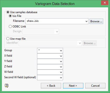 Multiple groups only apply to Isis databases. ASCII mapfiles consist of one group. If you plan to use a triangulation to limit the sample values (next panel), then you must select values for the X, Y, and Z coordinate fields for the samples.