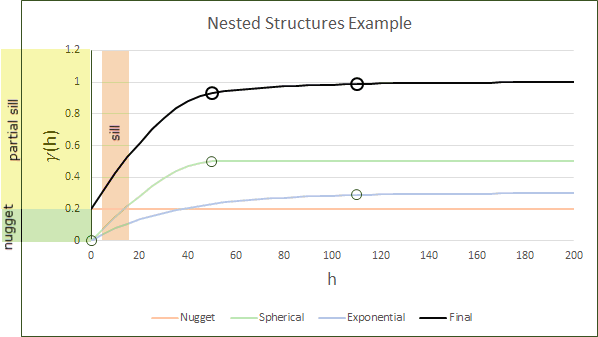 A nested variogram is a linear combination of several types of variograms allowing precise matching of sample behaviour. Up to 8 variograms can be nested in Vulcan.