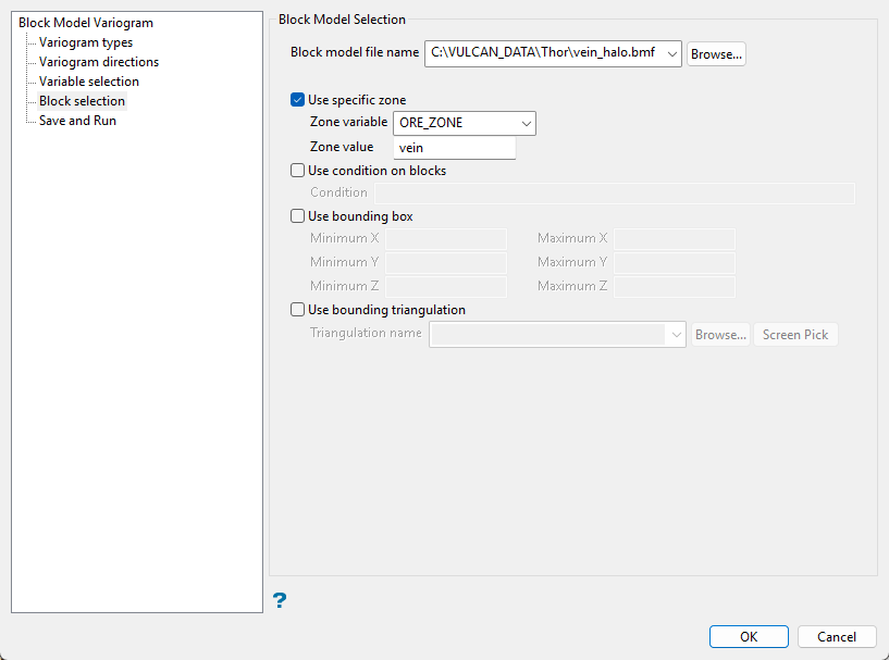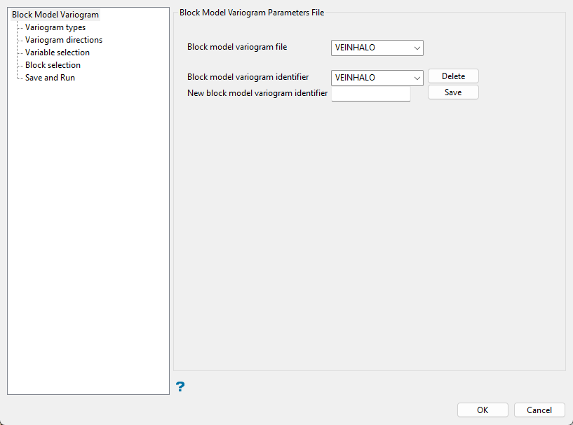 Enter, or select the Block model variogram file from the drop-down list, the name of the Block Model Variogram specification file (