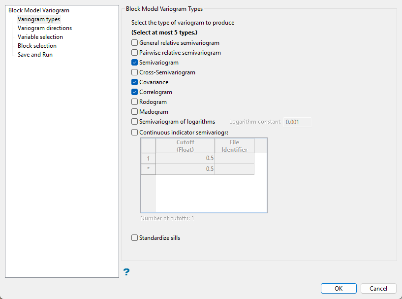 This section allows you to select the block model variables that will be used to calculate the variograms. The primary variable will be used to calculate the variograms, while the secondary variable is used to calculate cross variography.