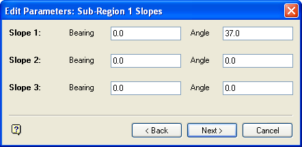 The number of slopes shown in the panel depends on the number you specified for the sub region on the previous panel. For each slope specify the clockwise bearing and the angle of the slope in degrees from horizontal.