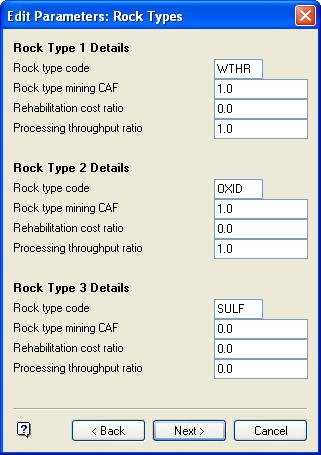 For each rock type specify a four character alphanumeric rock type code; mining CAF, cost per tonne for rehabilitation and processing factor.