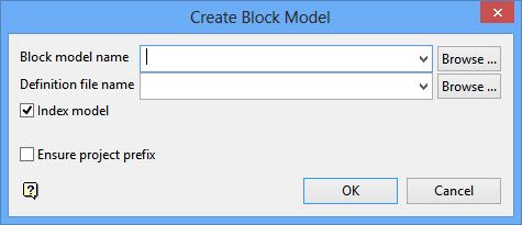 Select Ensure project prefix to use the project code as a prefix when naming the resulting block model. If this check box is checked, then the full name of the resulting block model will be <proj><name>.bmf.